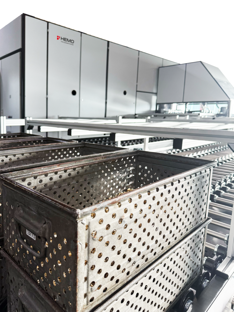 This method is particularly advantageous when cleaning entire mesh boxes, as it can handle large volumes in a short time and integrates well into automated production processes. Modern systems feature solvent recovery, explosion protection, and process monitoring to ensure both safety and environmental compliance. Continuous-flow systems allow very short cycle times while maintaining a separation between the dirty and clean areas of the system.