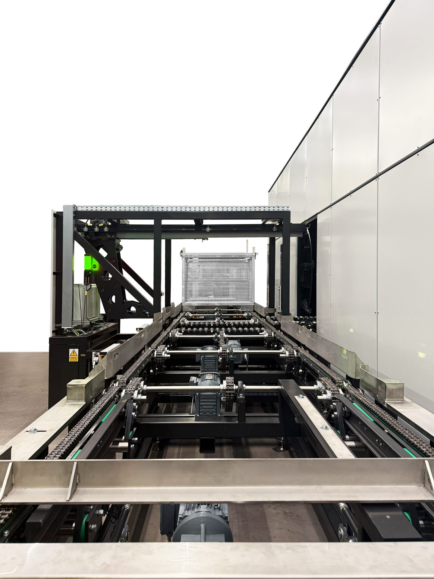 Die vollautomatische Beschickung ist zweispurig und mit automatischer Deckelverriegelung ausgeführt, um gleichzeitig zwei Körbe mit jeweils 470x320x200mm zu reinigen. So kann maximaler Durchsatz bei höchster Reinheit erzielt werden.